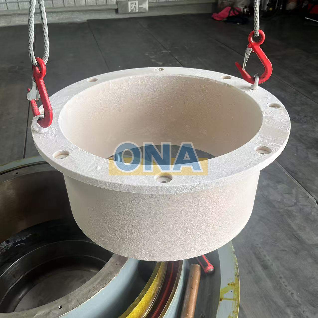 - The installation method is interference fit: the new lower head bushing needs to be cooled with dry ice for at least 2 hours before installation. After sufficient cooling, the lower head bushing is lifted with a lifting ring to ensure that the lower head bushing edge and the bottom edge of the head assembly are parallel.
