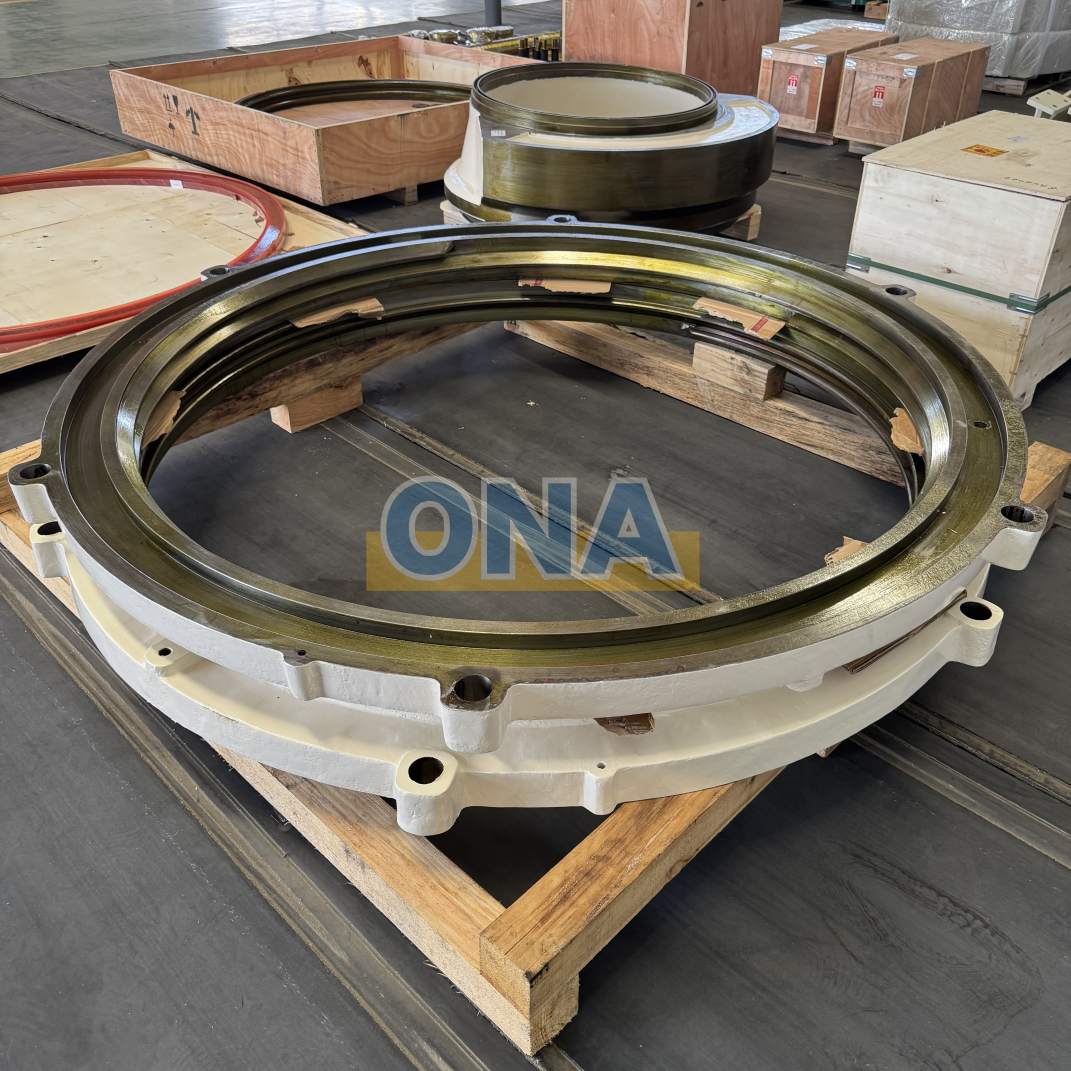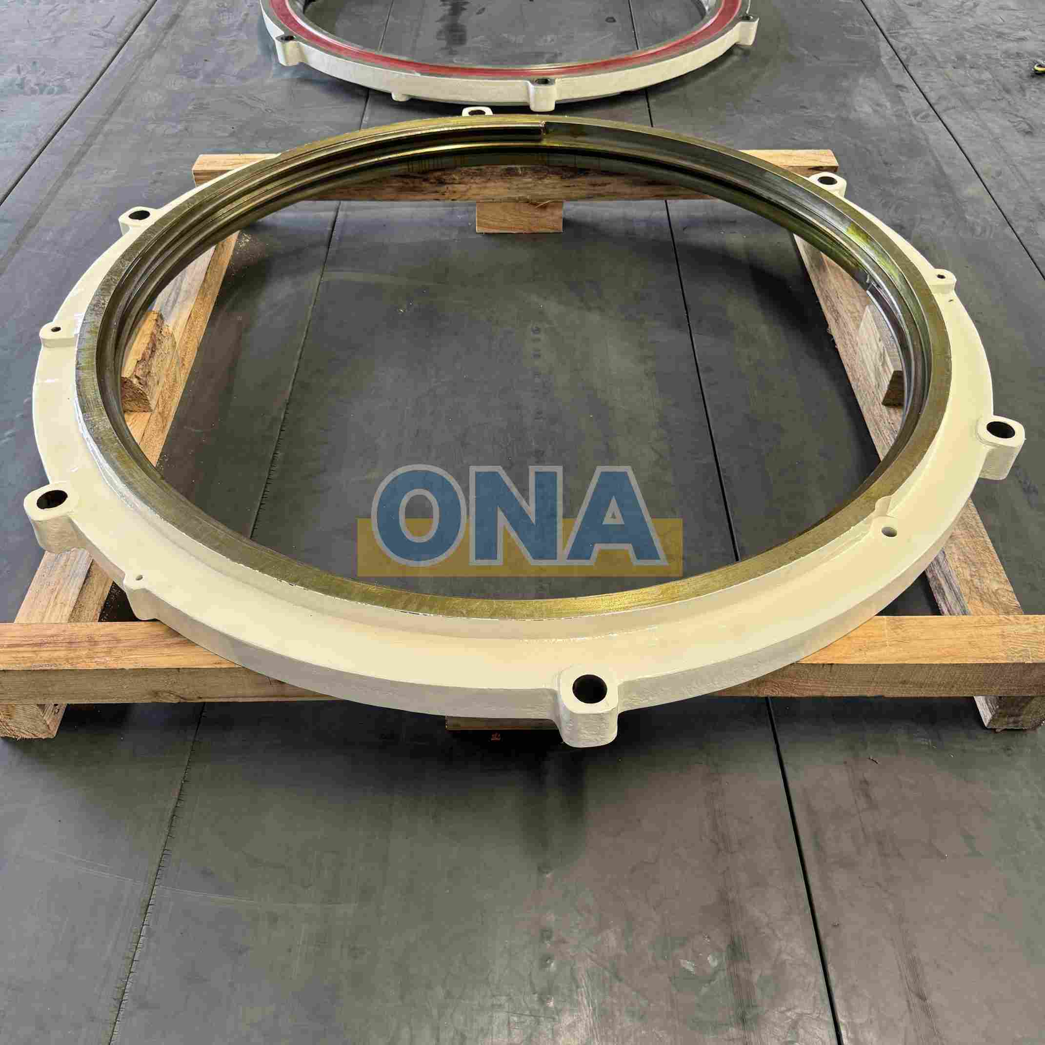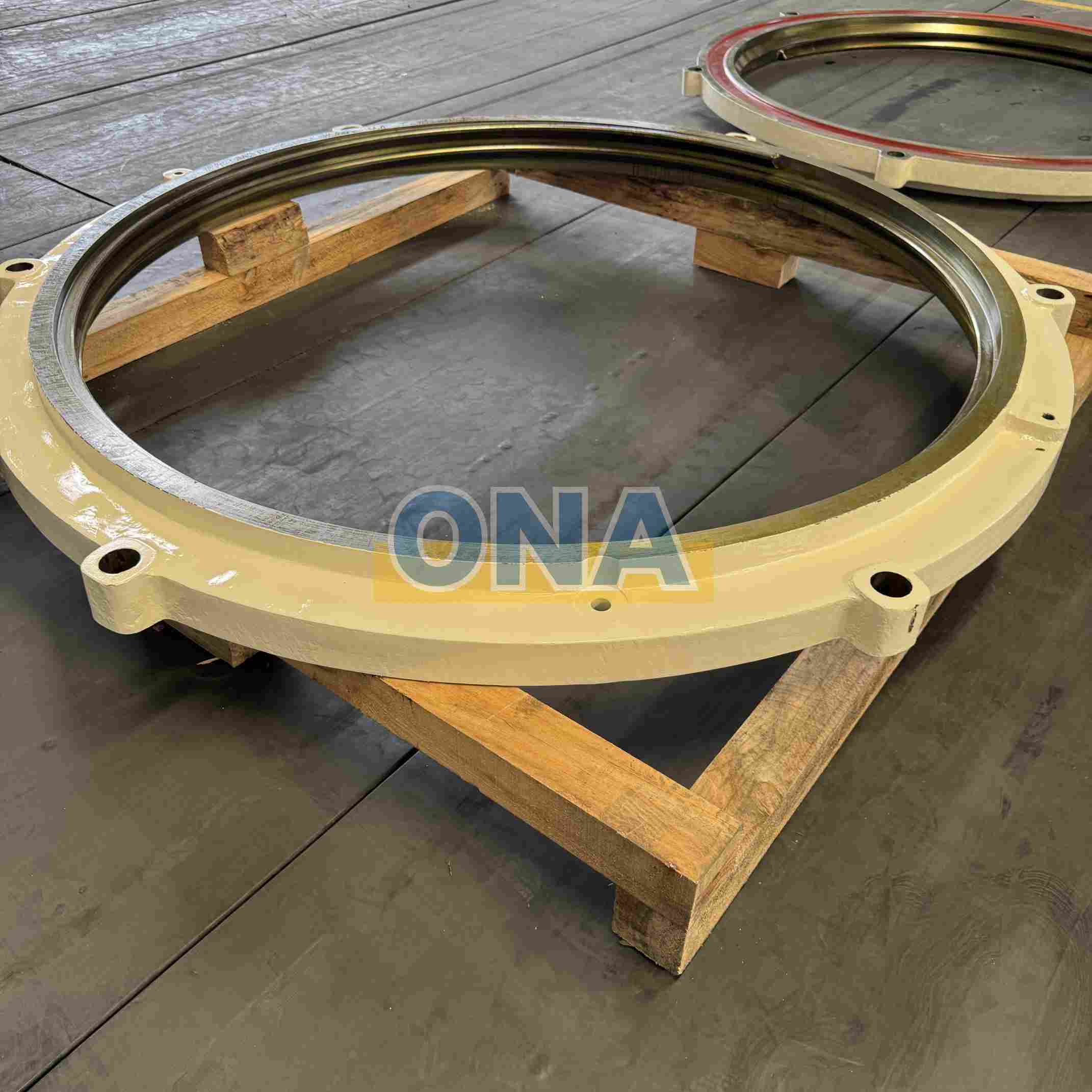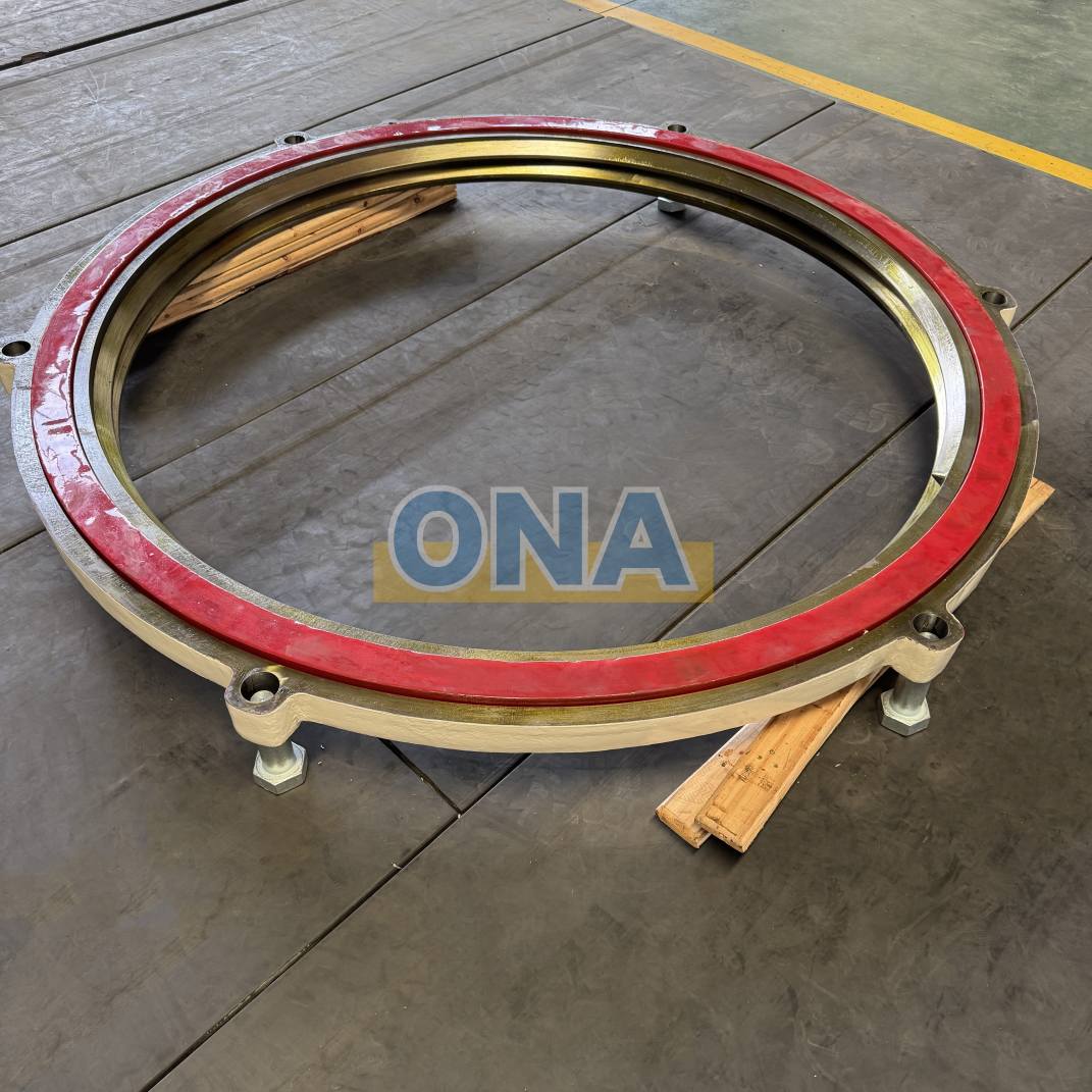 1The crusher part clmping ring assembly is a key fixing device for the cone crusher, including clmping rings, hydraulic ring clamping set, dust covers, and other accessories. It is mainly used to prevent the bowl assembly from rotating spontaneously due to vibration during crusher operation, ensuring stable discharge port dimensions and thus guaranteeing the crusher's working efficiency.